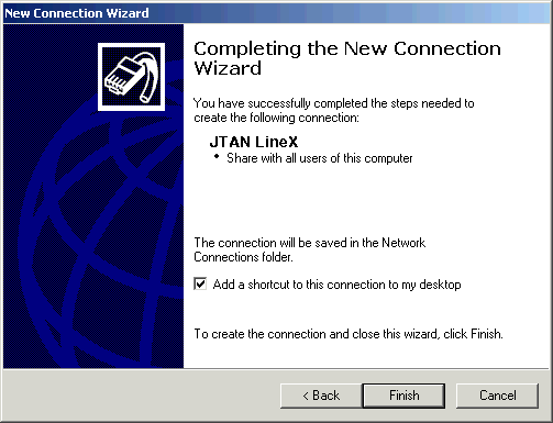 Congratulations! You have successfully configured Dial-Up Networking! In order to connect, you would now double-click the JTAN LineX shortcut you created on your desktop.